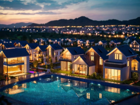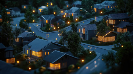 A captivating nighttime view of a suburban neighborhood showcasing houses illuminated with warm lights, surrounded by trees, creating a serene and tranquil atmosphere.