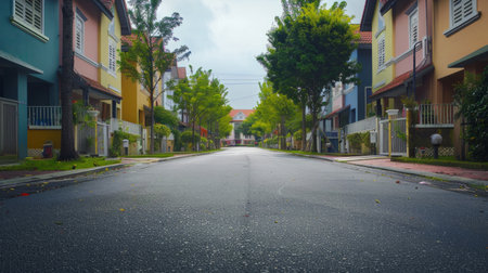 A row of contemporary suburban houses with vibrant facades lined along a quiet street. the colorful homes contrast beautifully with the surrounding autumnal foliage, creating a serene and inviting residential scene. Generative AI