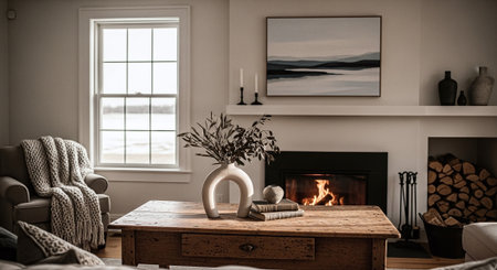 Cozy living room interior with wooden table, fireplace and flowers in vase