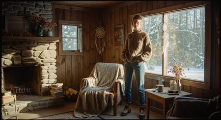 Young woman in the interior of a country house. A girl in a knitted sweater stands near the window.
