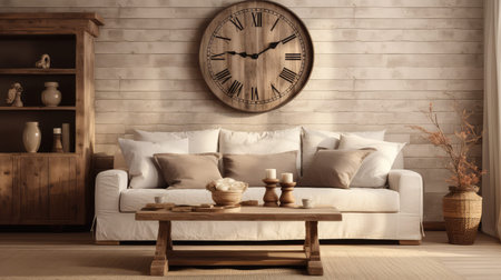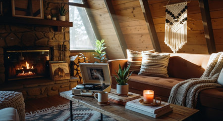 Cozy rustic living room with wooden ceiling and comfortable seating in warm natural light. That the image is generated using AI.