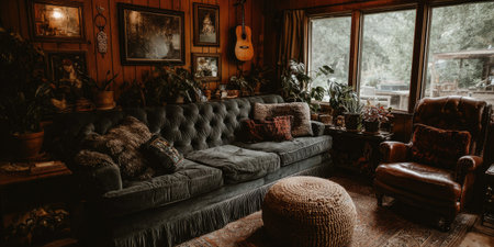 An interior shot reveals a living room with a large tufted sofa, armchair, and ottoman. Warm tones dominate, with wooden paneling and a guitar adding to the ambience. Windows allow natural light to filter in, suggesting a daytime setting. Suitable for various editorial and commercial applications.