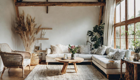 Cozy sunlit living room with beige sofa and rustic decor. That the image is generated using AI.