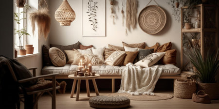 The interior of the room is in the style of ethno. A room lit by light from a window. AI generated.