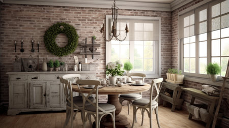 Interior design inspiration of Farmhouse Shabby Chic style home dining room loveliness decorated with Wood and Brick material and Accent Wall .Generative AI home interior design .