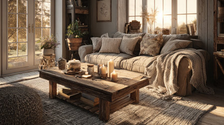 A warm and inviting living room filled with natural light, showcasing rustic decor elements, cozy textiles, and a wooden coffee table adorned with candles, perfect for relaxation.