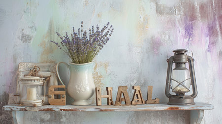 Shabby chic interior decor for farmhouse. Lavender in pitcher