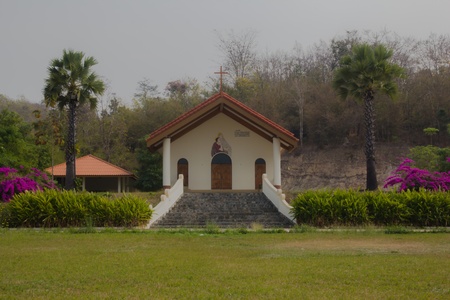 Christian cross, altar, candle and flower bouquet in a church chapel