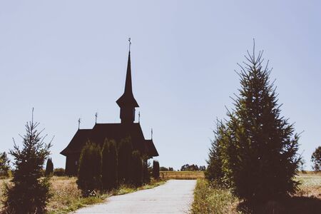 Vintage view of an old wooden church with thuja trees alongside the alleyway in Maramures