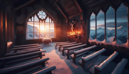 Tranquil wooden chapel amidst snowy forest landscape at dawn.