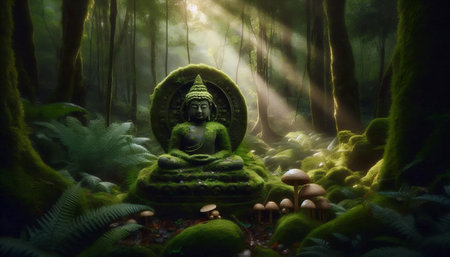 Buddha sits peacefully among blooming lotus flowers in a tranquil garden, reflecting harmony and serenity.