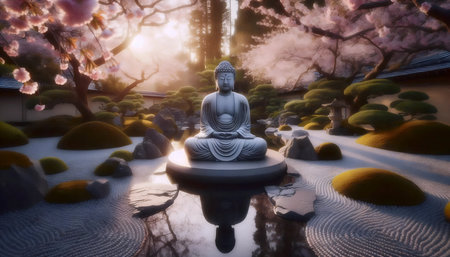 Japanese zen garden with blooming cherry blossoms - 3D render