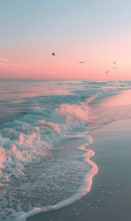 Waves gently rolling onto a sandy beach with a pastel sky in the background at sunset, A peaceful beach at sunset, with pastel skies and gentle waves crashing