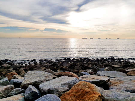 Seashore with pebbles and stones in the evening at sunset