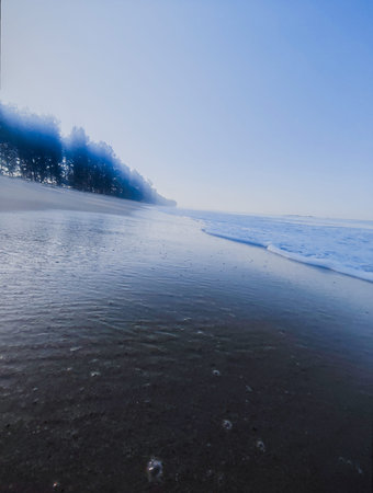 A tranquil seascape features soft waves lapping against a sandy shore under a foggy sky, evoking a sense of peace and natural beauty at the ocean.