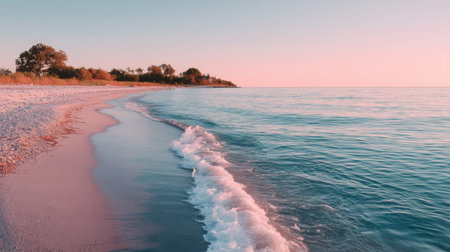 Captivating beach landscape featuring gentle waves lapping against a serene shoreline during sunset. Ideal for travel, nature, and relaxation themes.