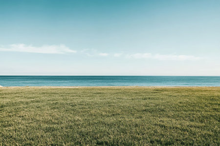 A vast stretch of lush green grass meets a tranquil ocean under a clear blue sky. Soft waves gently lap against the shoreline, while distant clouds cluster in the horizon, creating a peaceful and serene atmosphere perfect for relaxation.
