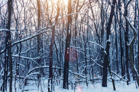 Snowy winter forest with sunbeams in the evening. Winter landscape.