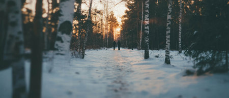 Snowy forest trail at sunset offers peaceful winter scene