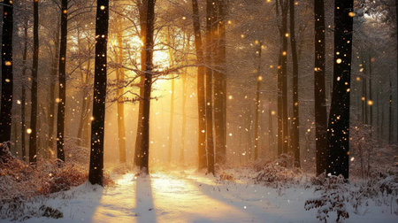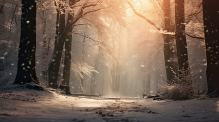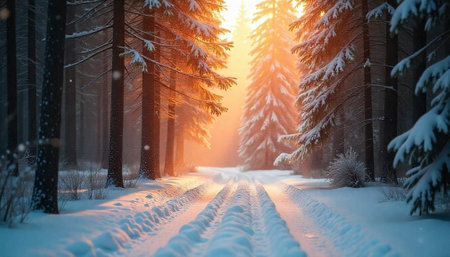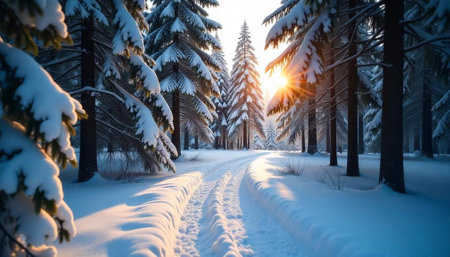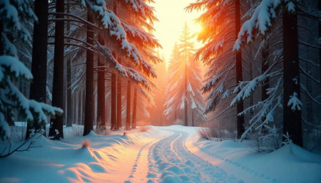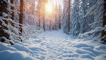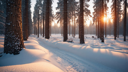 Snowy forest path at sunrise with golden sunlight shining