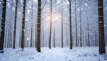 A winter forest with snow gently falling and the soft glow of sunlight peeking through the trees