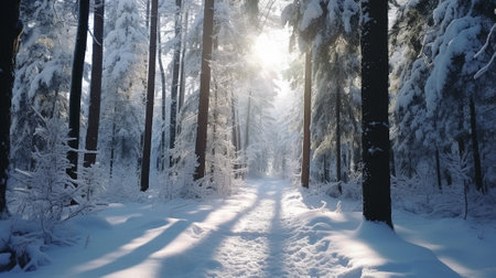 Snowy winter landscape with sunlit path through a forest