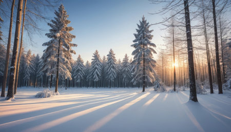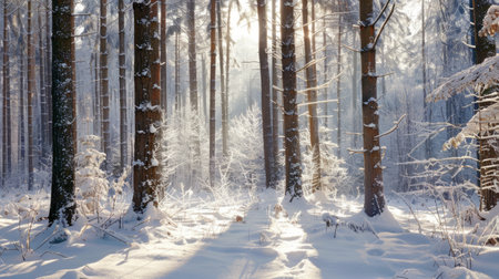 Snow-covered forest landscape with sunshine filtering through pine trees on a cold winter day