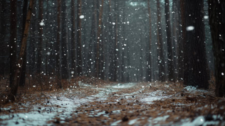 Snowflakes adorn a silent forest trail in winter.