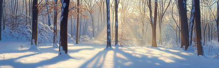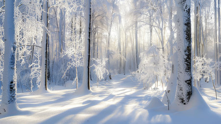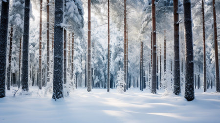 Serene winter forest in tranquil morning light with fresh snowfall.