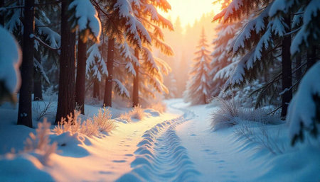 Snowy path through serene winter forest at sunset