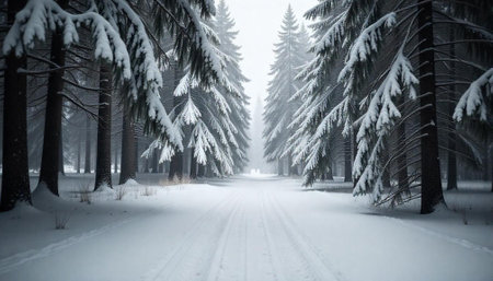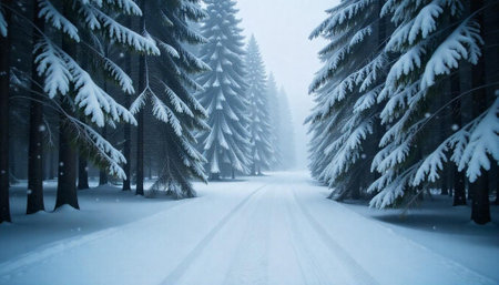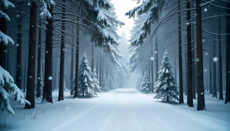 A snow covered forest path with tall evergreen trees creates serene winter landscape. scene evokes sense of tranquility and natural beauty