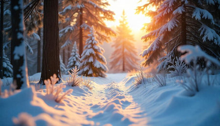 Snowy forest path bathed in golden winter sunlight