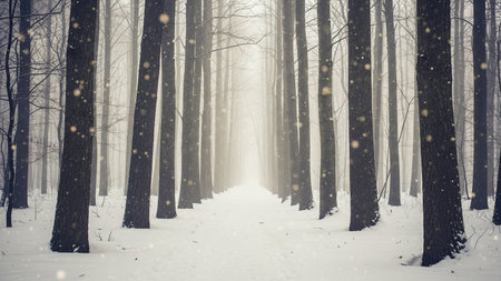 A serene winter landscape unfolds with a snow-covered path leading through a dense forest. Tall, dark tree trunks stand in a symmetrical line on either side of the path, their bare branches reaching towards the sky. Soft, diffused light filters through a gentle winter fog, creating an ethereal and atmospheric mood. Delicate snowflakes are seen falling, adding to the sense of a quiet, cold, and peaceful winter day. The perspective draws the viewer down the vanishing path, evoking a feeling of...