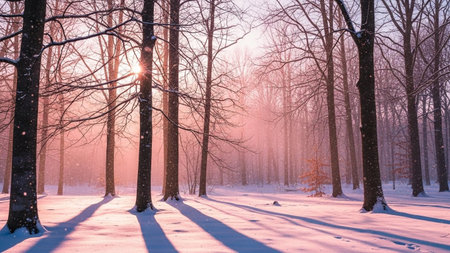 A serene winter forest scene bathed in the soft glow of dawn or dusk. Sunbeams pierce through the bare branches of tall trees, casting long, dramatic shadows across the snow-covered ground. Delicate snowflakes drift down, adding to the tranquil and ethereal atmosphere. The sky is a soft, rosy pink, enhancing the peaceful and magical of this natural landscape.