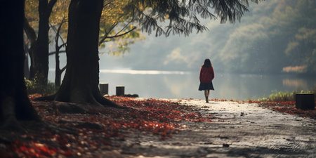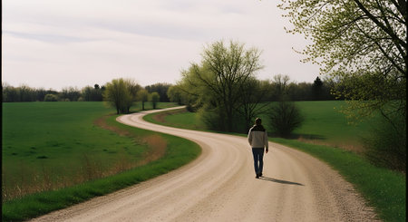 A solitary individual strolling peacefully through picturesque surroundings. Concept Nature Walk, Tranquility, Peaceful Moments, Serene Travel, Mindful Wanderlust