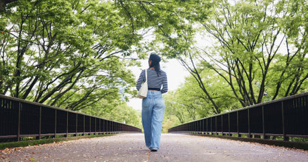 Walking, back and person on vacation, bridge and adventure for tourist, commuting and exploring of Tokyo. Outdoor, student and tourism of environment, travel and scenery of destination in Japan