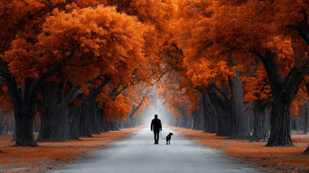A picturesque autumn scene featuring a man and his dog walking down a serene, tree-lined path enveloped in vibrant orange leaves, creating a peaceful atmosphere.
