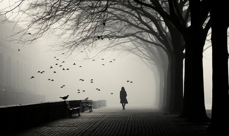 A human silhouette slowly fades into thick fog on an empty path, evoking feelings of loss and uncertainty during morning hours.