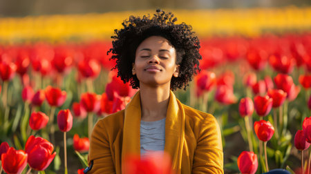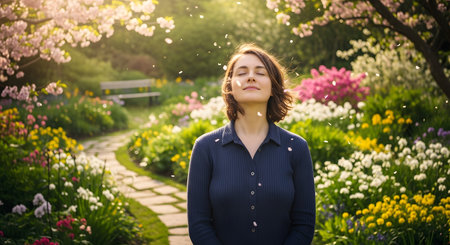 A serene young woman stands in a blooming garden with her eyes closed, enjoying the falling flower petals and fresh spring air. The scene is filled with vibrant colorful flowers and soft sunlight, evoking feelings of peace and happiness.