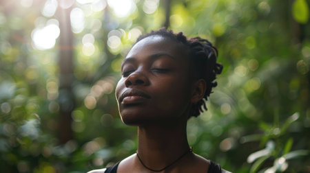 Serene Black Woman Finding Inner Peace Through Mindfulness Meditation in Lush Green Oasis