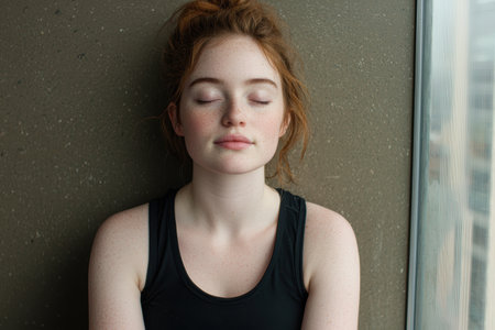 Serene Young Woman with Closed Eyes in Peaceful Pose Against Dark Background.