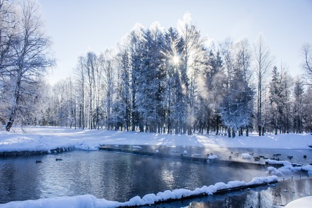 Beautiful winter landscape with snowy trees and river in sunny day.