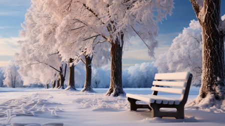 the essence of a serene winter park, adorned with pristine snow, inviting benches, majestic trees, and winding pathways. The hushed beauty of the season is perfectly embodied in this image.