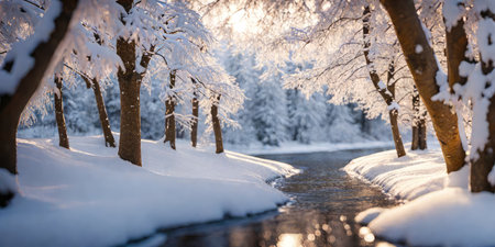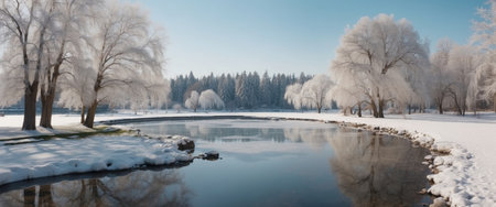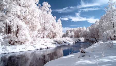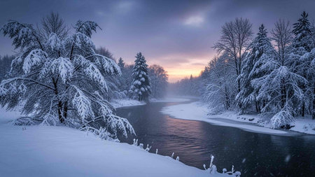 Discover a tranquil winter river scene, featuring snow-covered banks, frosty trees, and gentle light creating a serene atmosphere in a stunning natural environment.