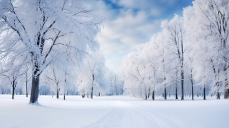 Frost-covered showing tire tracks lead down a snowy park path lined with frost covered trees keywords: winter, snow,...