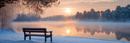 Tranquil Winter Landscape with Misty Reflections on a Frozen Lake Surrounded by Snowy Trees
