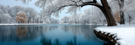 Tranquil Winter Landscape Serene Lake Reflecting Snow-Covered Trees in a Peaceful Snowfall Scene