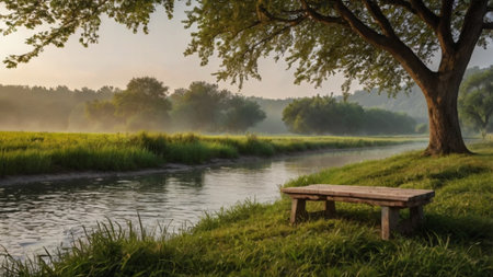 A tranquil riverside scene at sunrise, with soft mist rising from the water, bordered by green grass and blooming wildflowers.