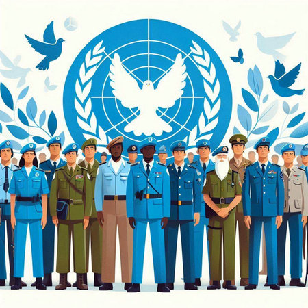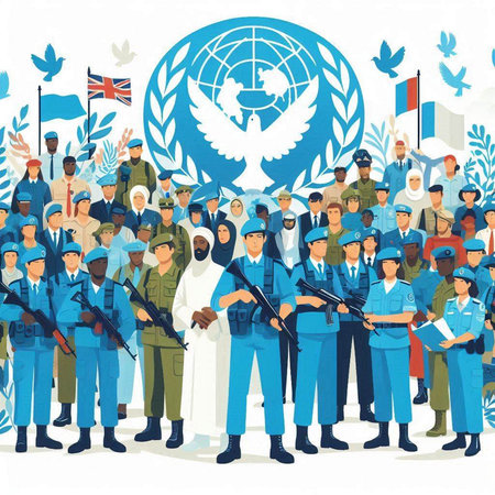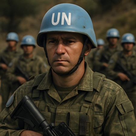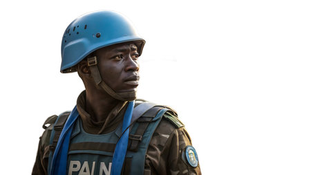 A professional peacekeeper in a blue helmet. Focused, vigilant, and resolute, this image conveys a deep sense of duty, commitment, and the quiet strength required for vital peacekeeping missions.