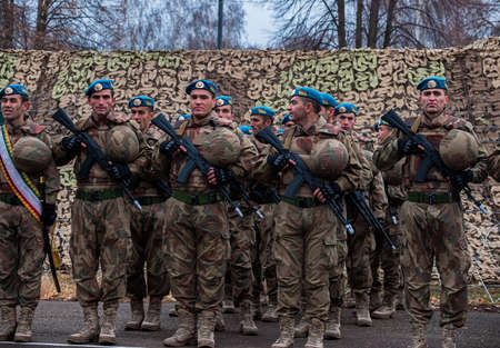 Bucharest, Romania - 1 December, 2021: Romanian army soldiers prepare for the Romanian national day military parade.